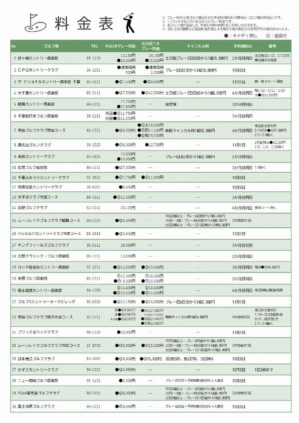 「市原市民ゴルフフェスタ」とは市原市民及び同伴するプレーヤーが、上記料金表の料金でラウンド出来るものですが、対象ゴルフ場の多くが会員制を敷く中、ある意味市原市民が会員並み待遇で迎え入れられるものになっています。